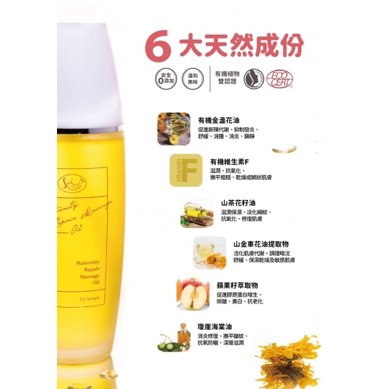 主成份:有機金盞花油、有機維生素F、山茶花籽油、山金車花油提取物、蘋果籽萃取物、瓊崖海棠油